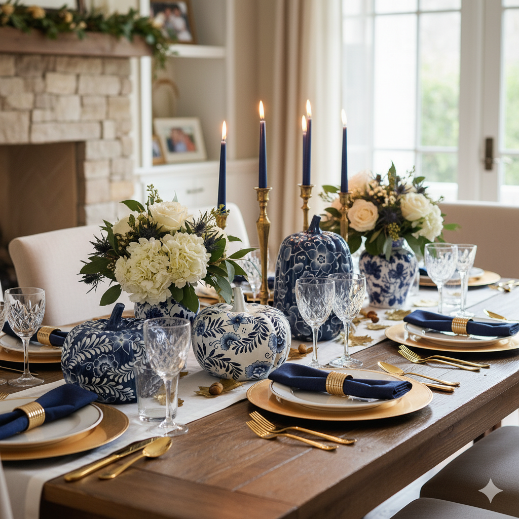 For a unique centerpiece, style a few blue Chinoiserie pumpkins down the center of the table. Their intricate patterns make them an eye-catching alternative to traditional fall décor. Add gold candlesticks topped with navy taper candles for height and a touch of drama. The combination of textures — glossy porcelain, metallic accents, and soft candlelight — feels effortlessly chic.