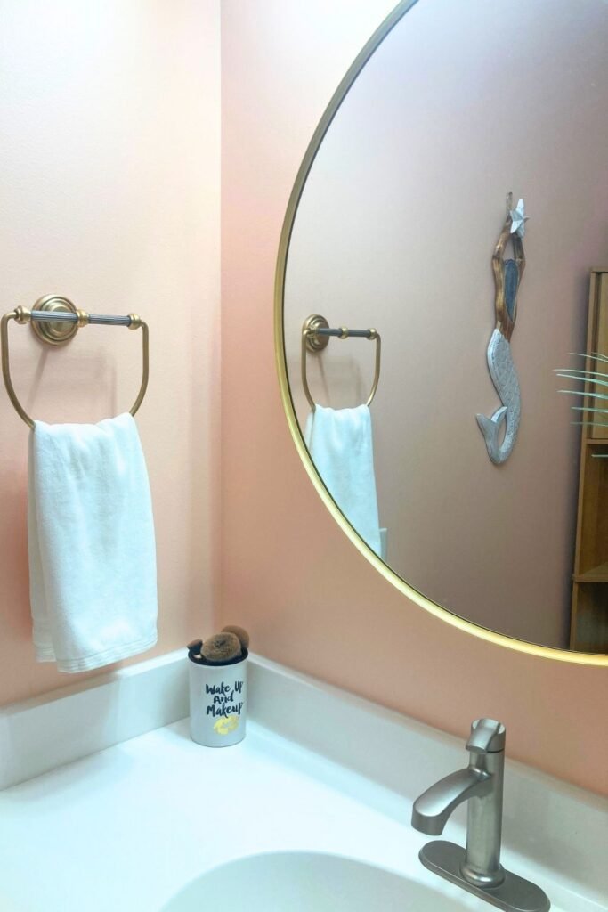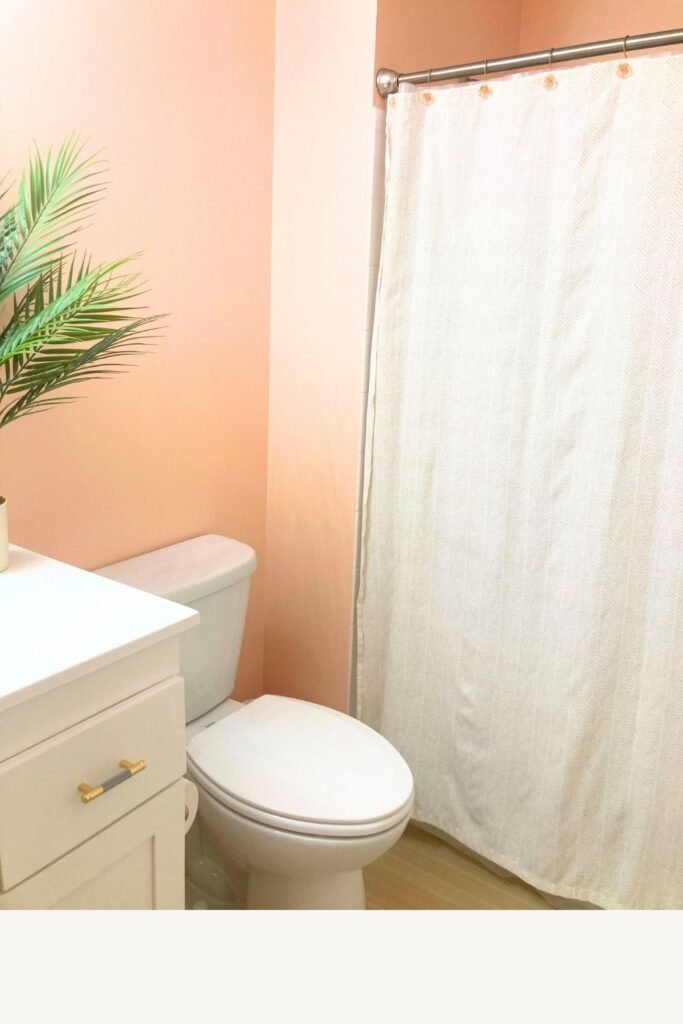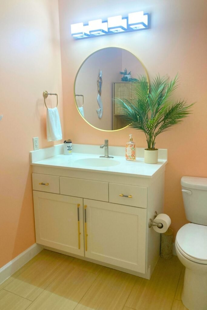 The foundation of the design started with soft peach (pale coral) walls, which immediately warmed the space while still keeping it light, airy, and reflective—exactly what you want in a smaller bathroom.