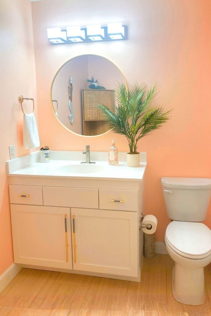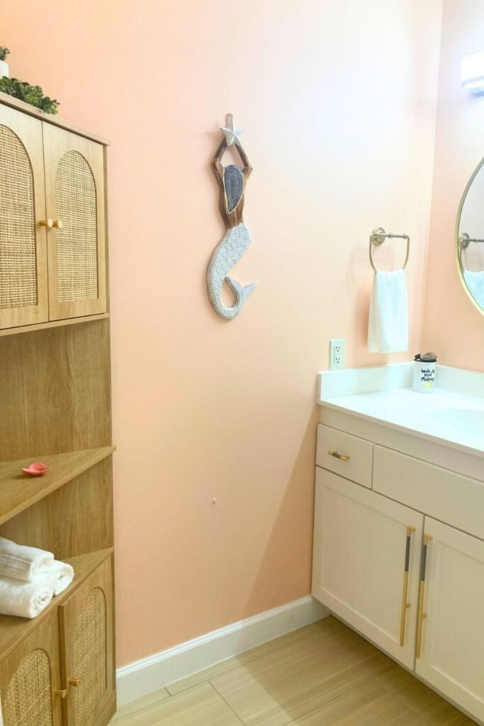 coastal bathroom with peach walls