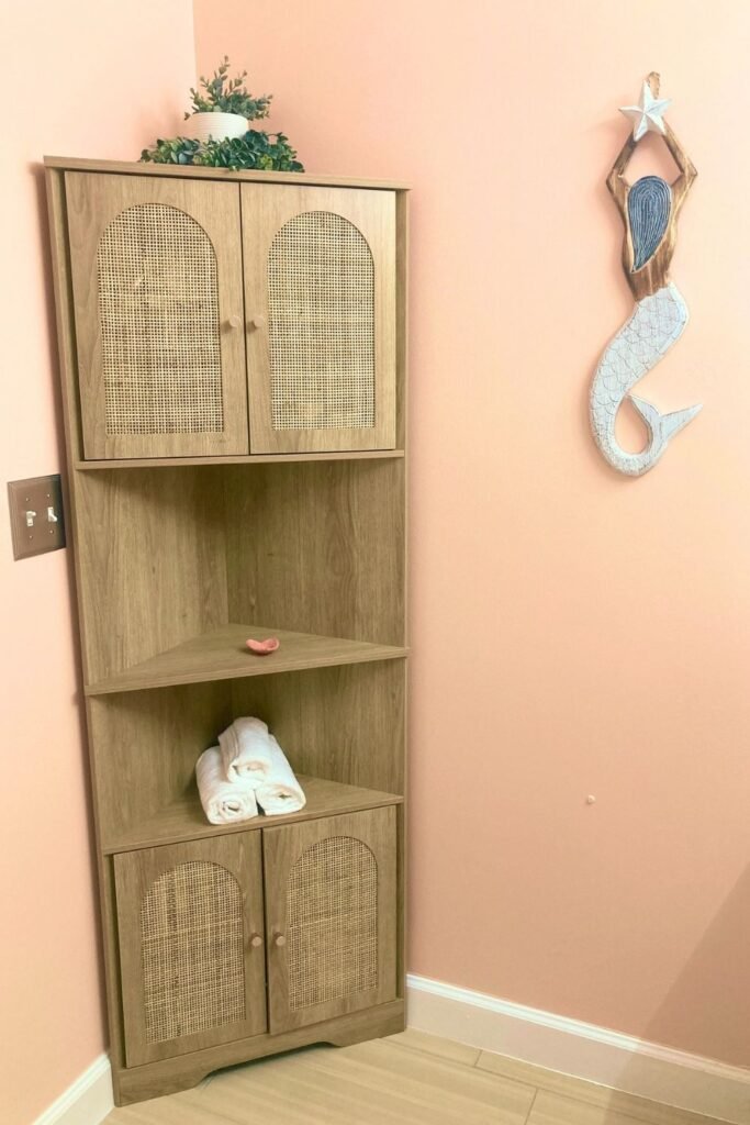 To increase storage without overwhelming the room, we added a corner cabinet.